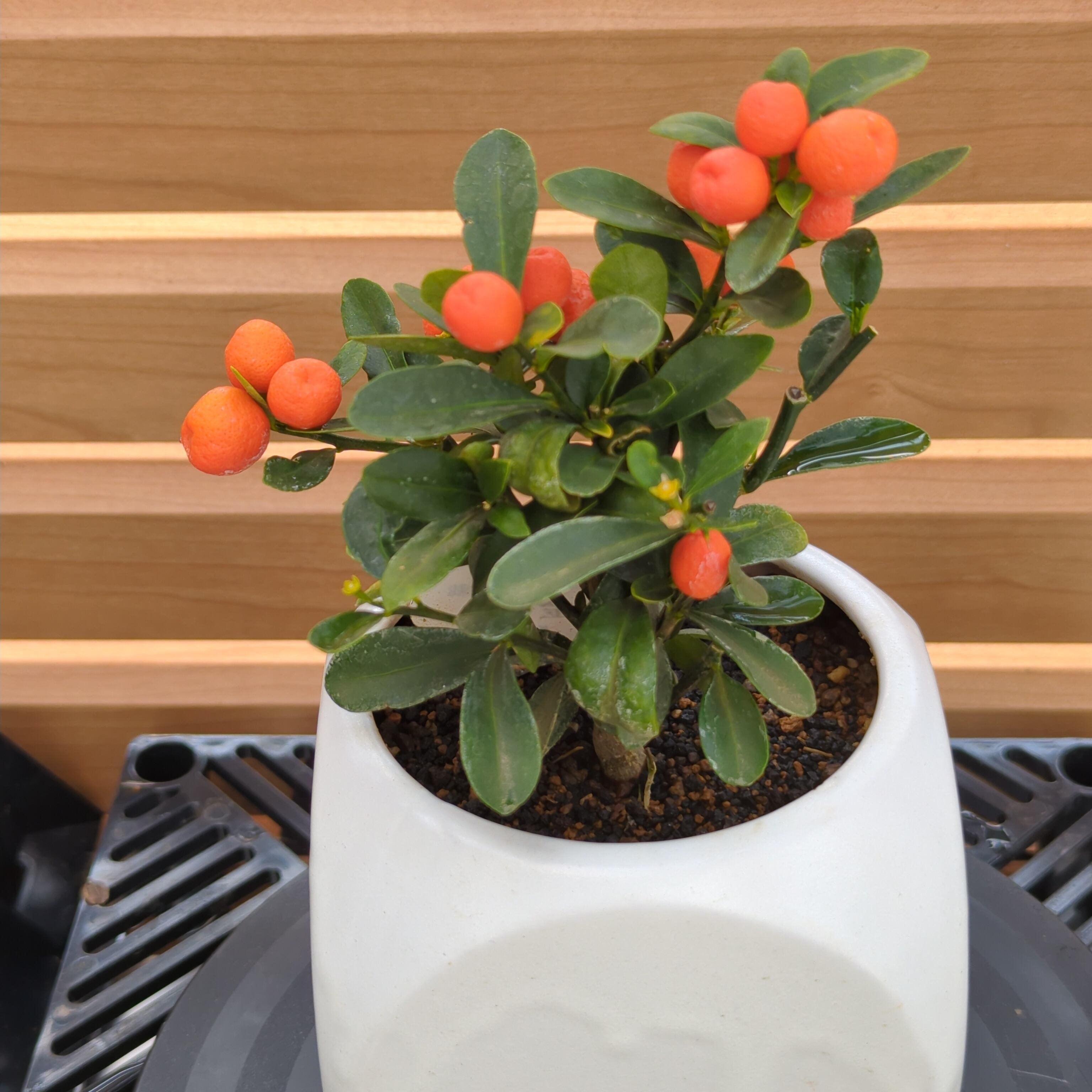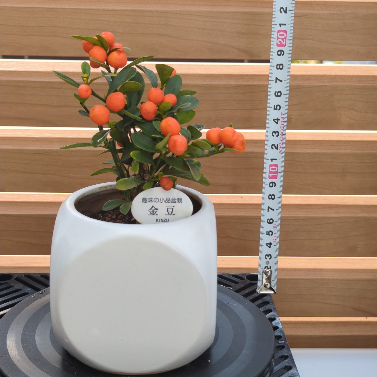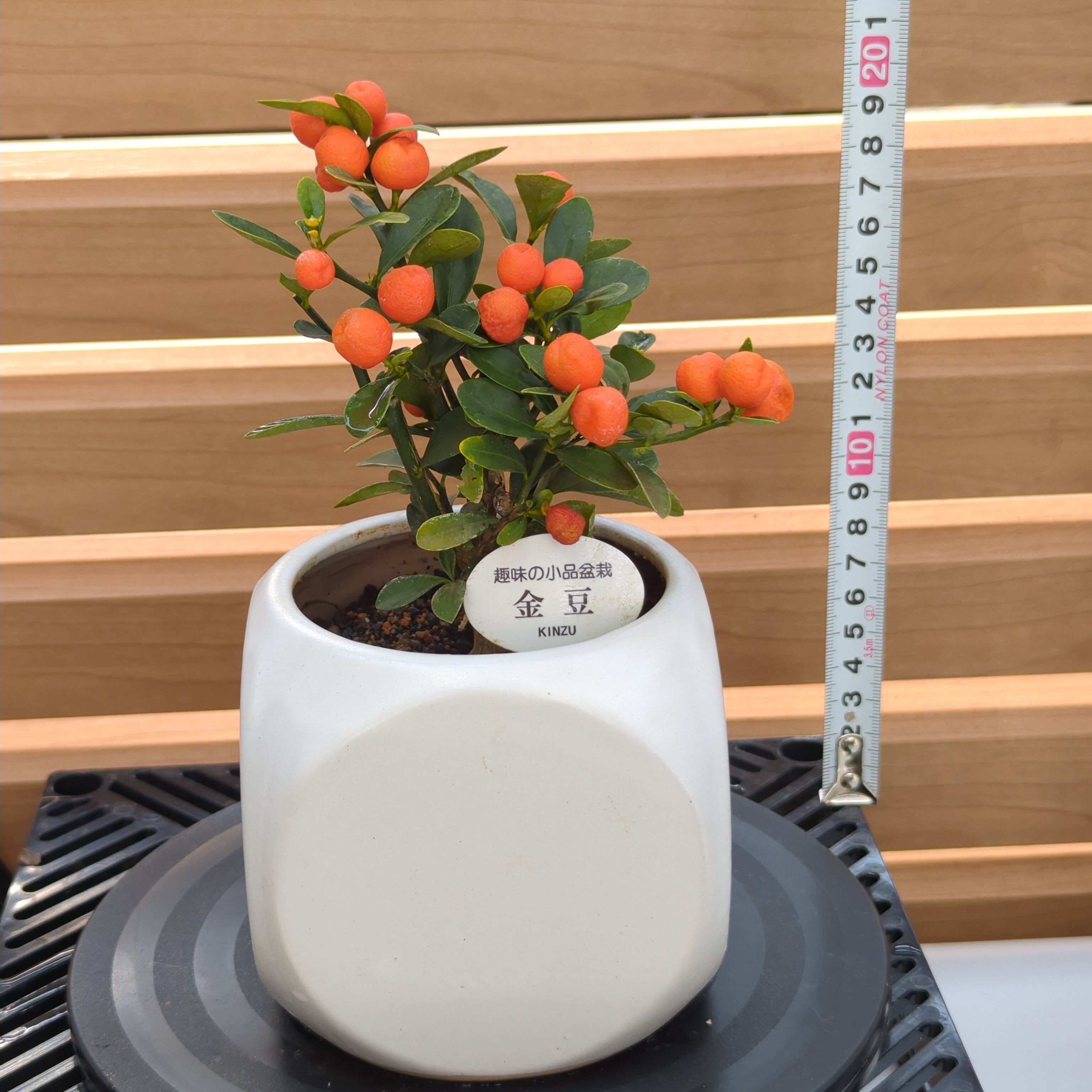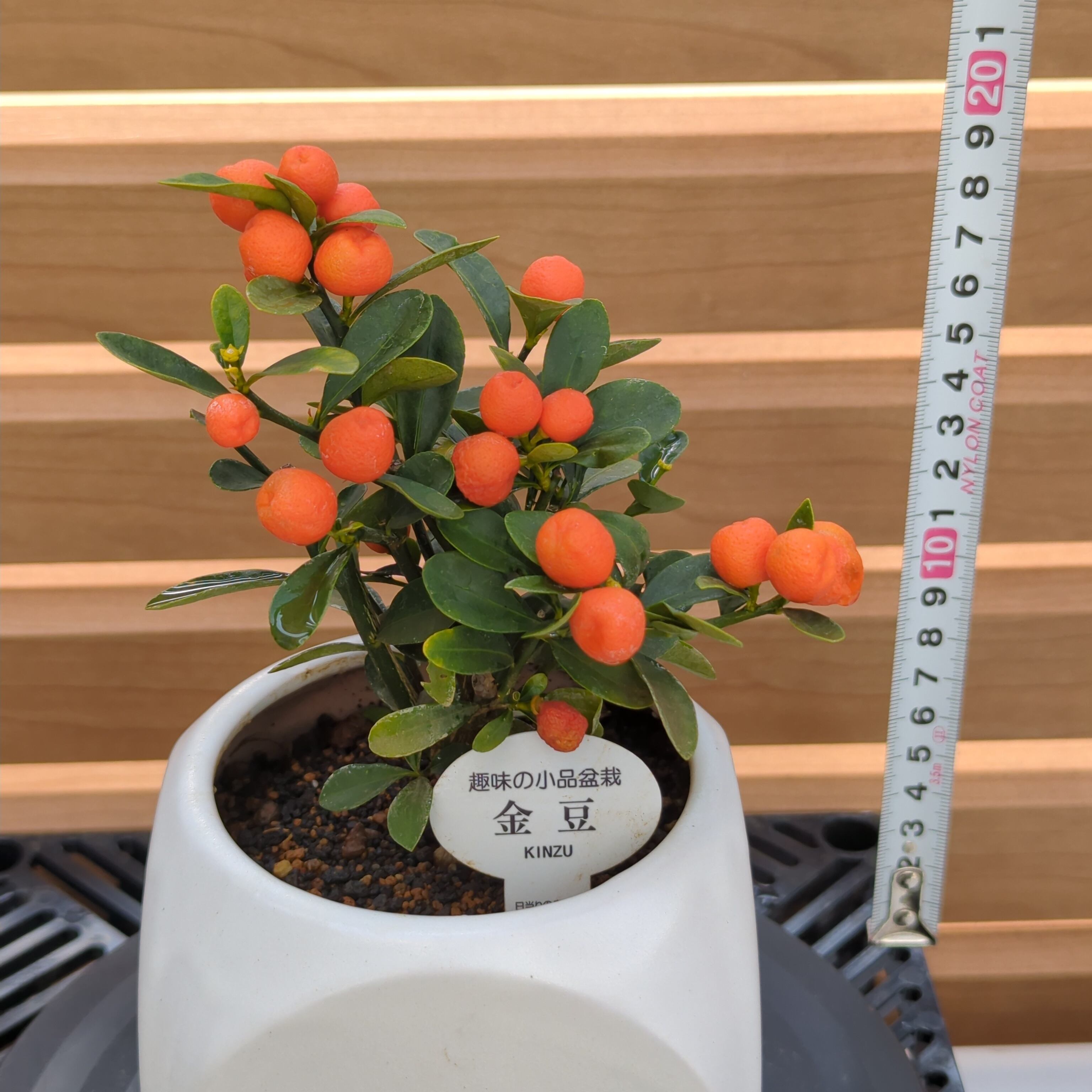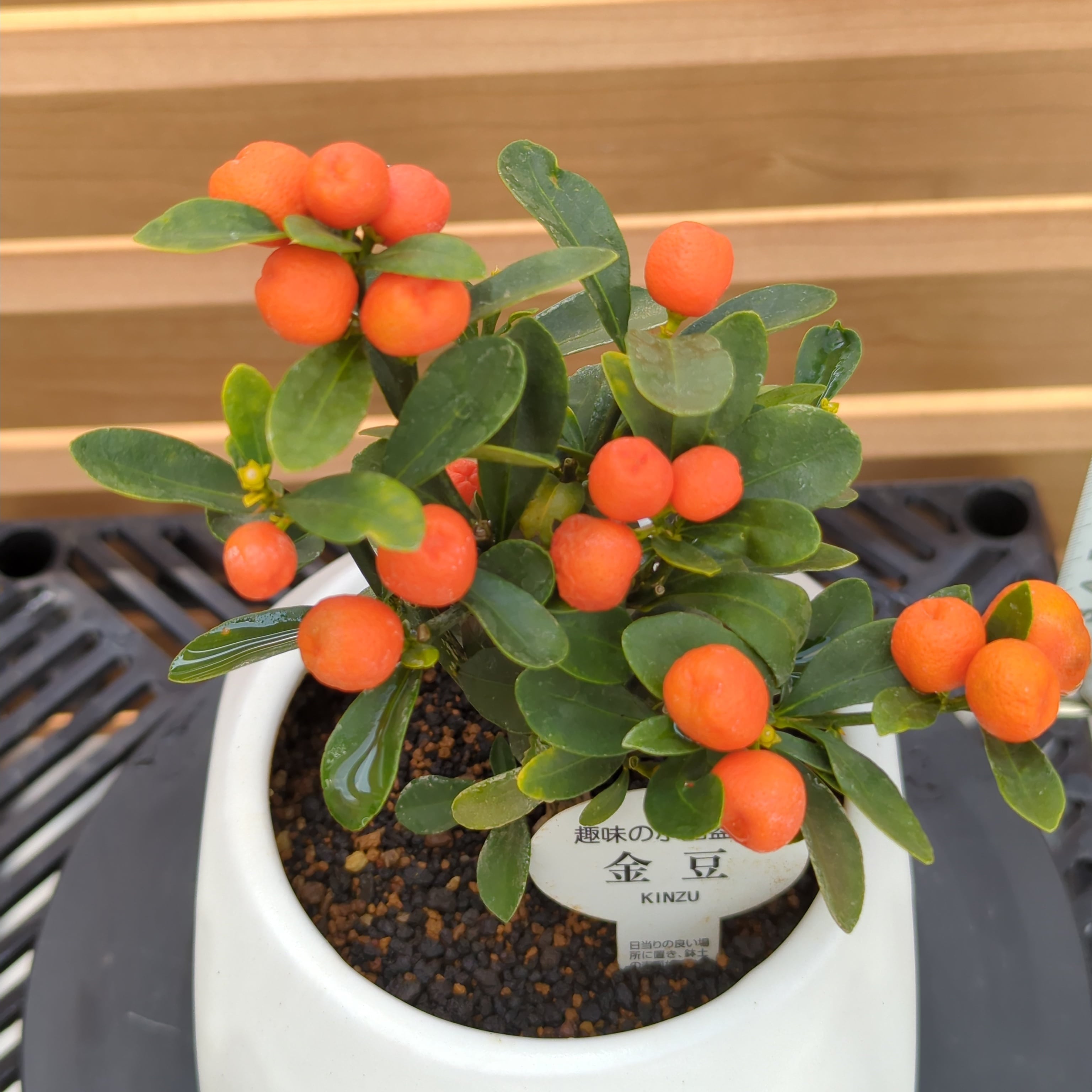 ・ミカン科キンズ属の常緑低木で、「金の豆」と書く縁起物の実もの盆栽です。