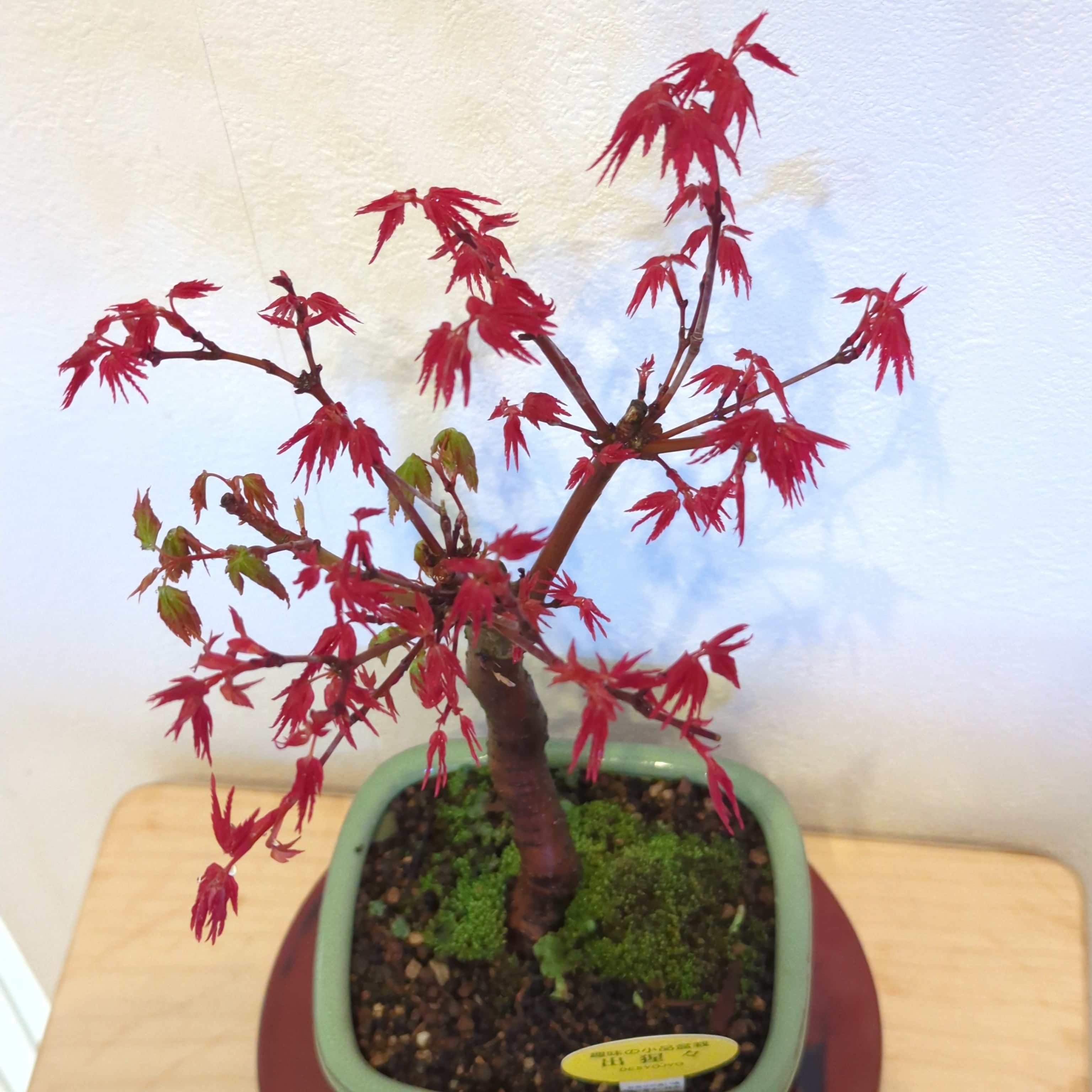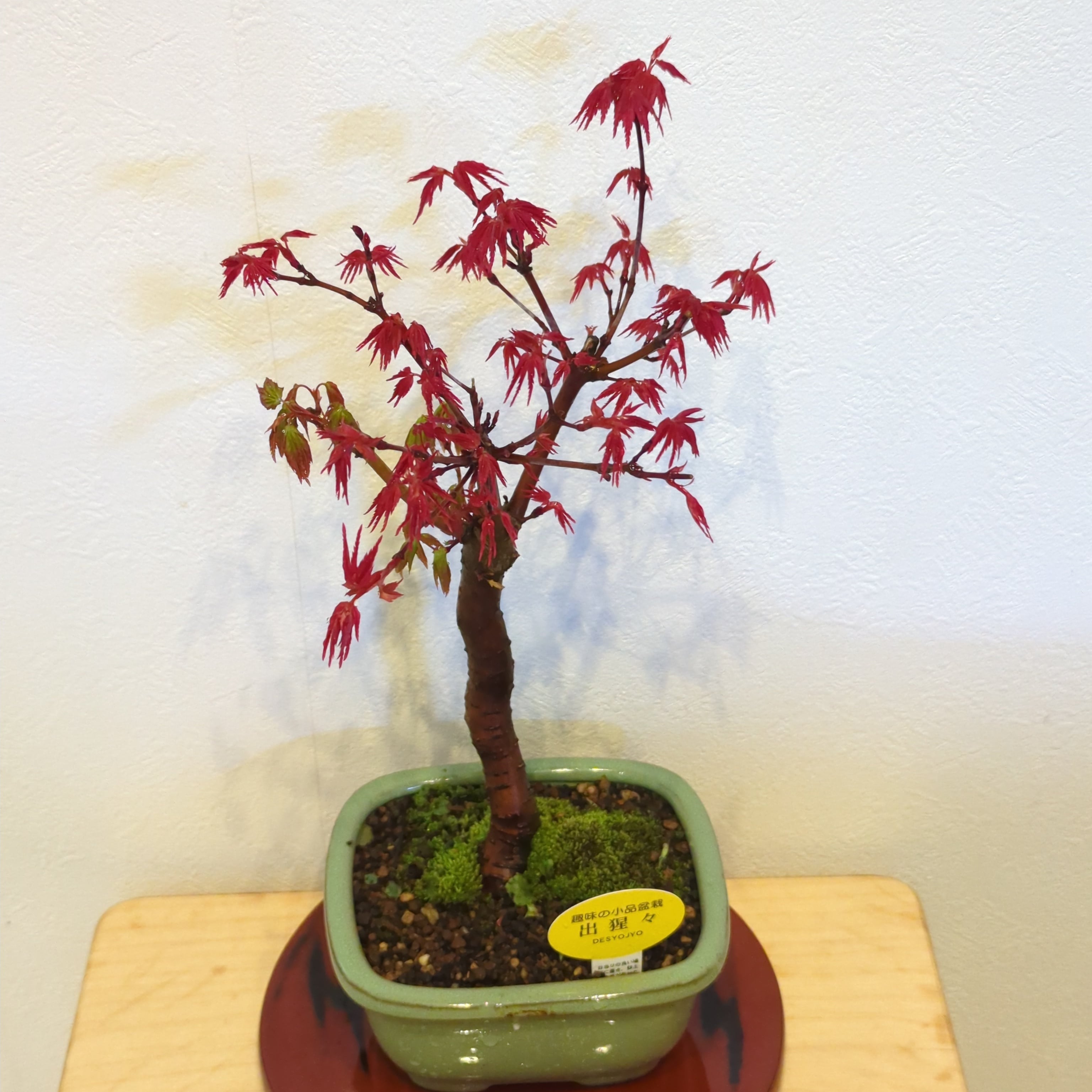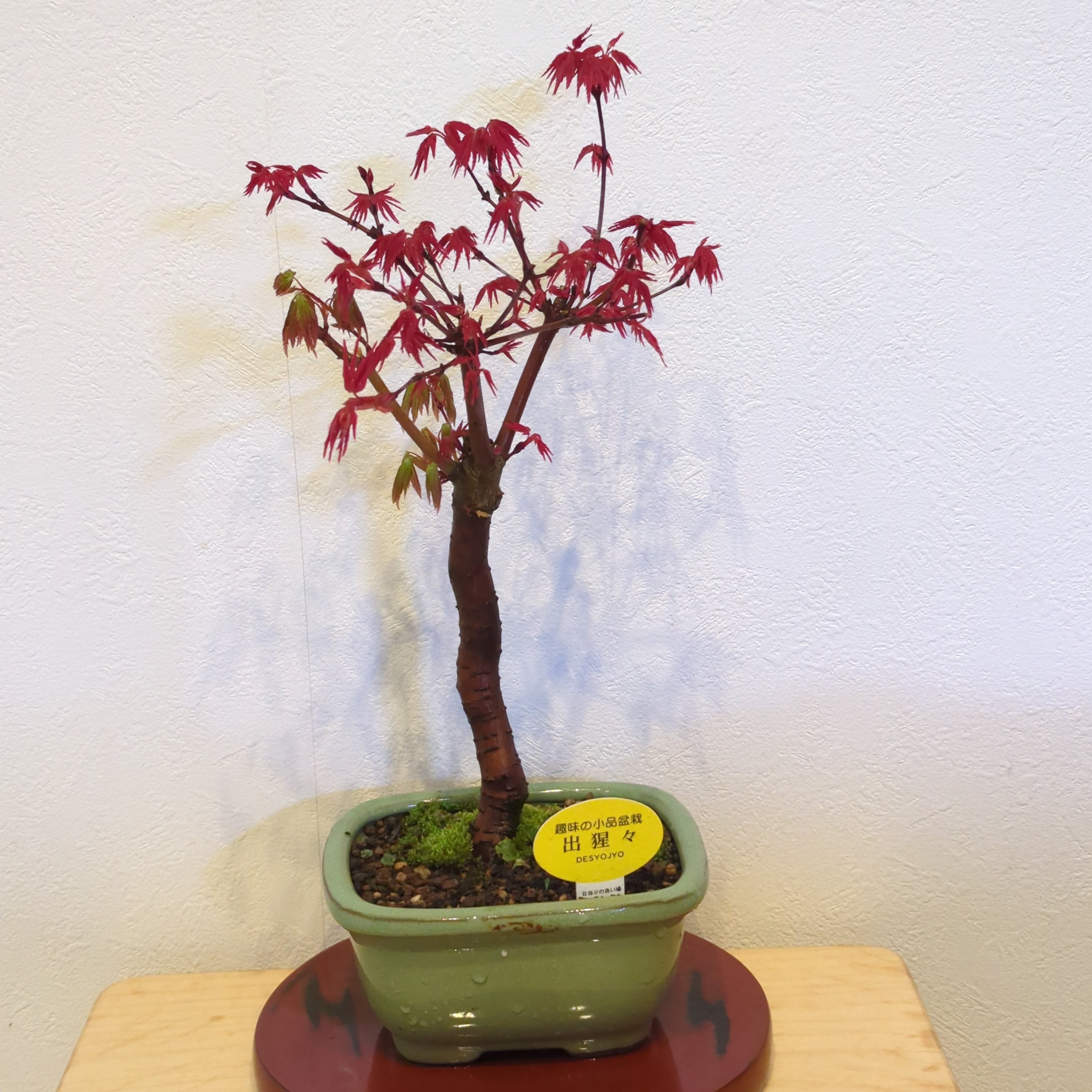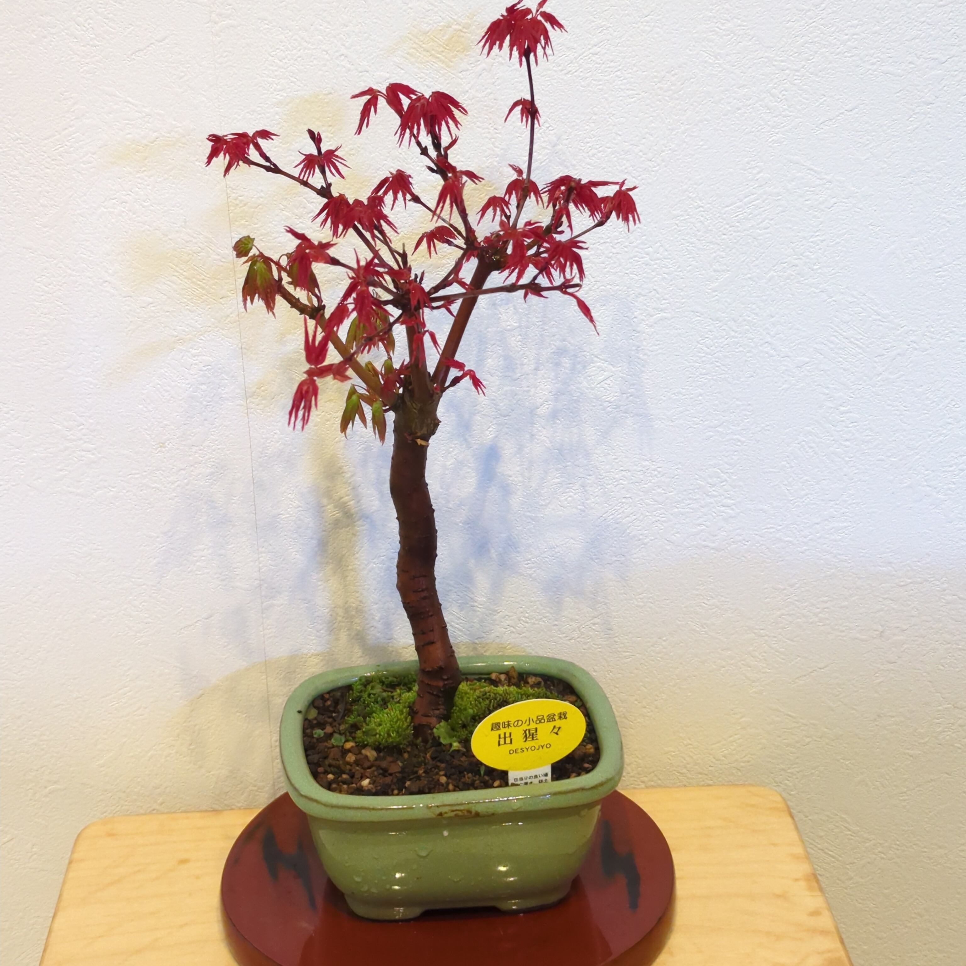 もみじ盆栽の中でも特に人気のある出猩々もみじ。 春と秋の二度、花を上回るくらい紅く美しい姿を披露してくれます。 出猩々(でしょうじょう)もみじの最大の魅力はこの新葉の鮮やかな赤です。 赤い葉の色は日々変化をし、5月にはしっかりとしたシャープな葉形でとても爽やかな緑色へと変わります。