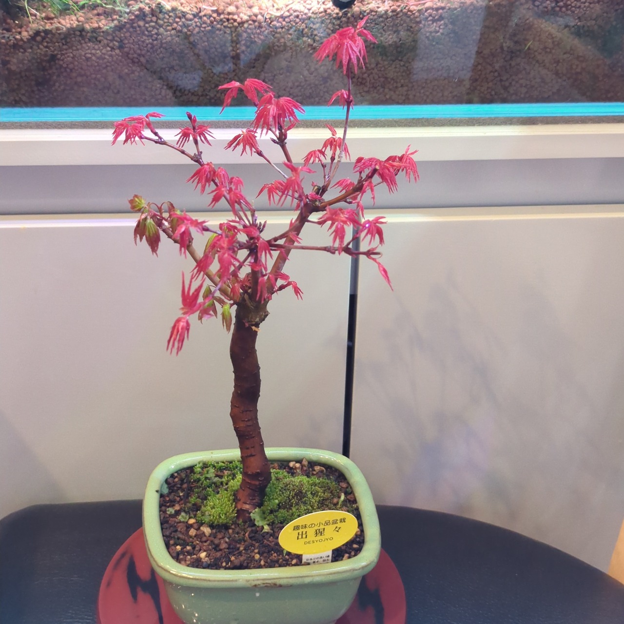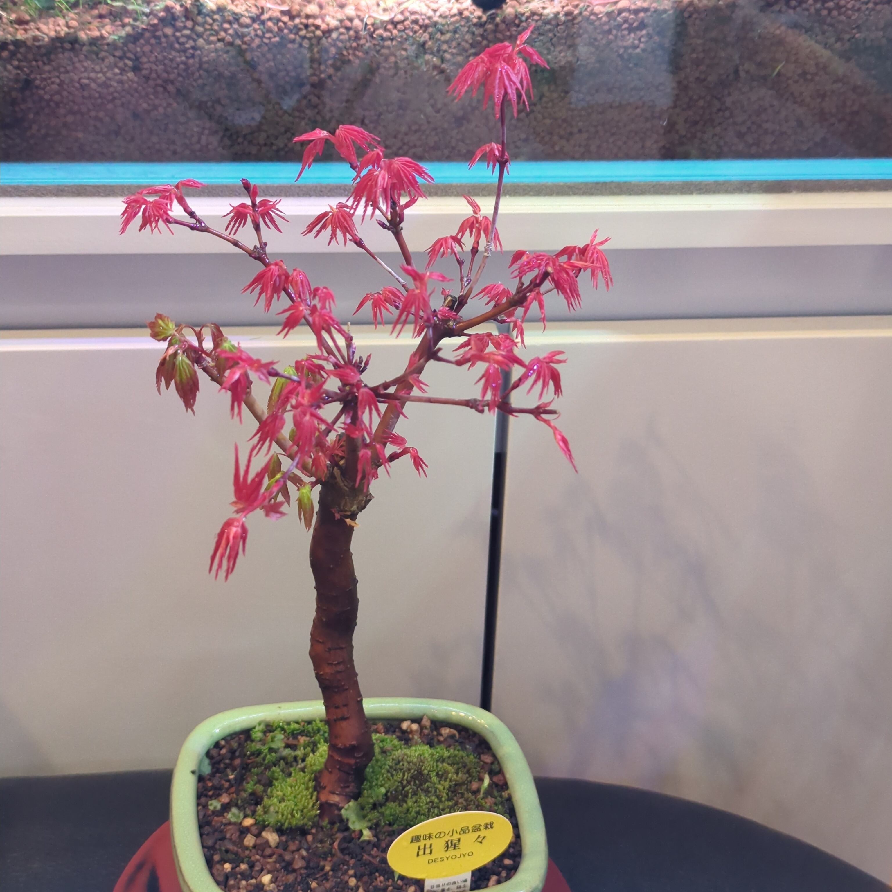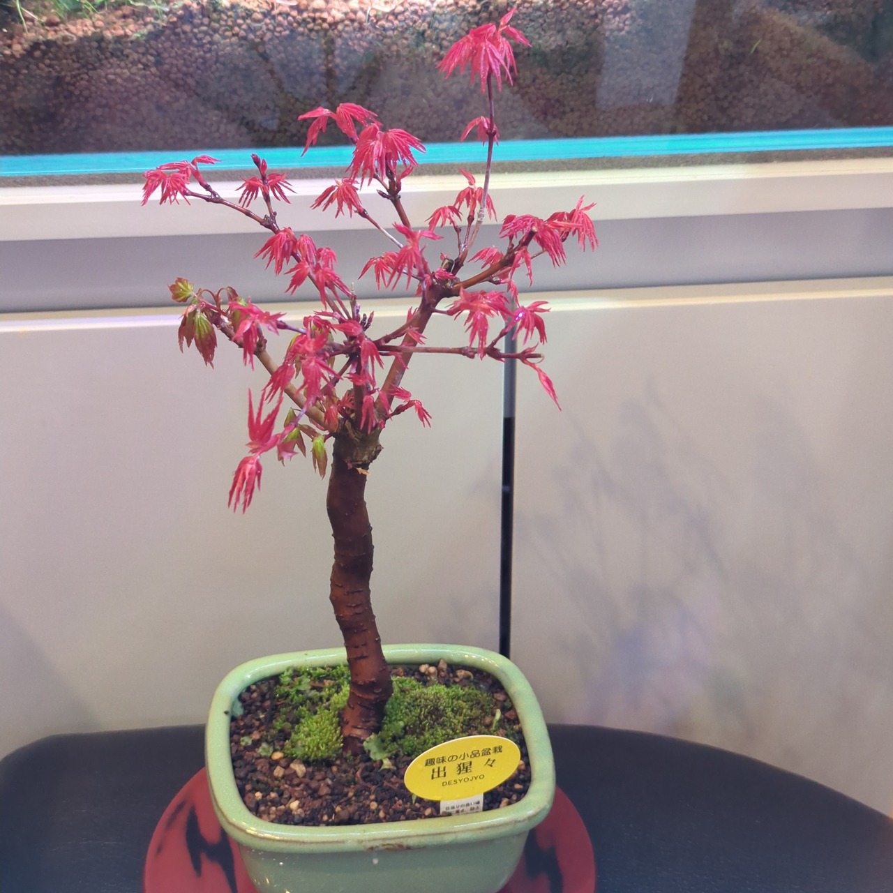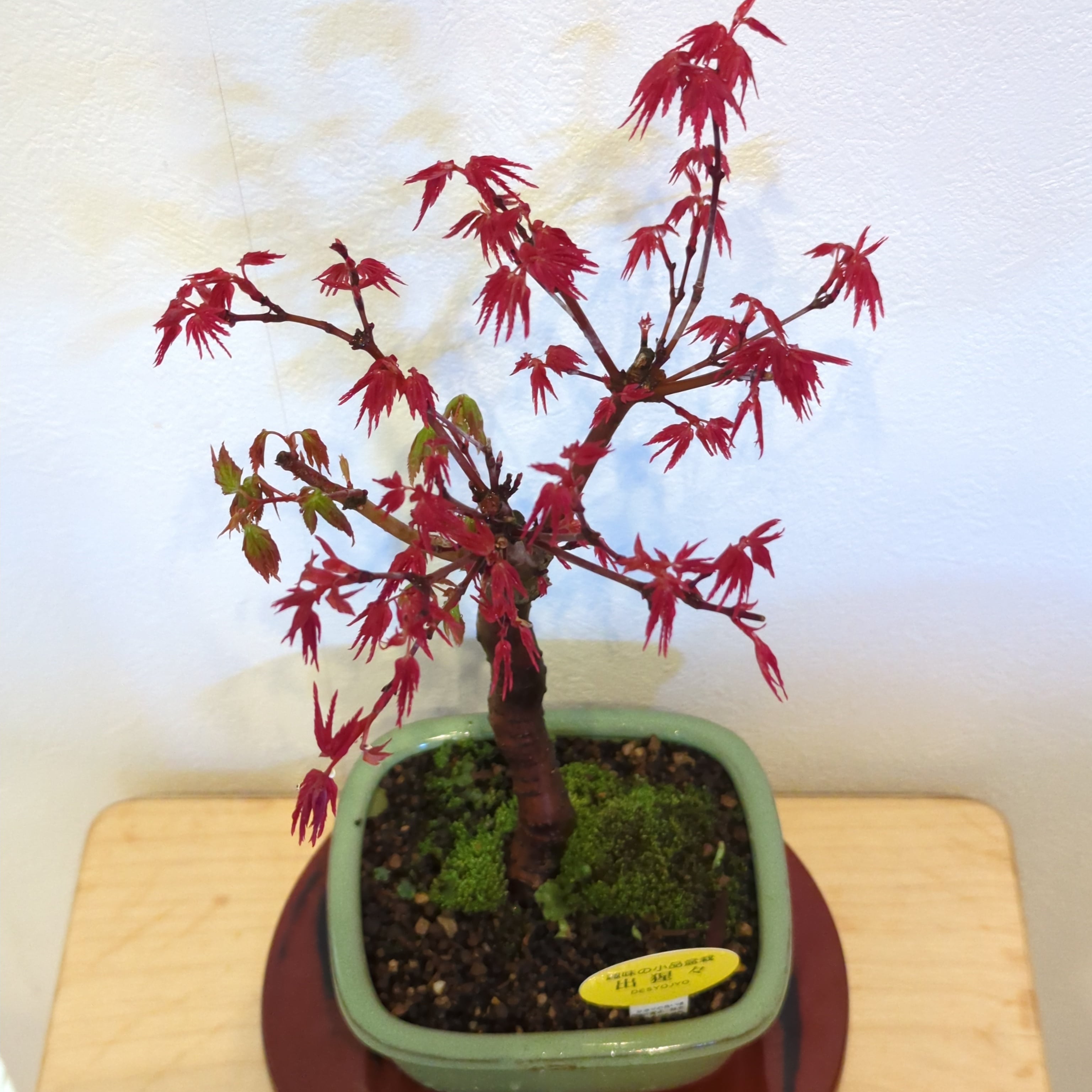 もみじ盆栽の中でも特に人気のある出猩々もみじ。 春と秋の二度、花を上回るくらい紅く美しい姿を披露してくれます。 出猩々(でしょうじょう)もみじの最大の魅力はこの新葉の鮮やかな赤です。 赤い葉の色は日々変化をし、5月にはしっかりとしたシャープな葉形でとても爽やかな緑色へと変わります。