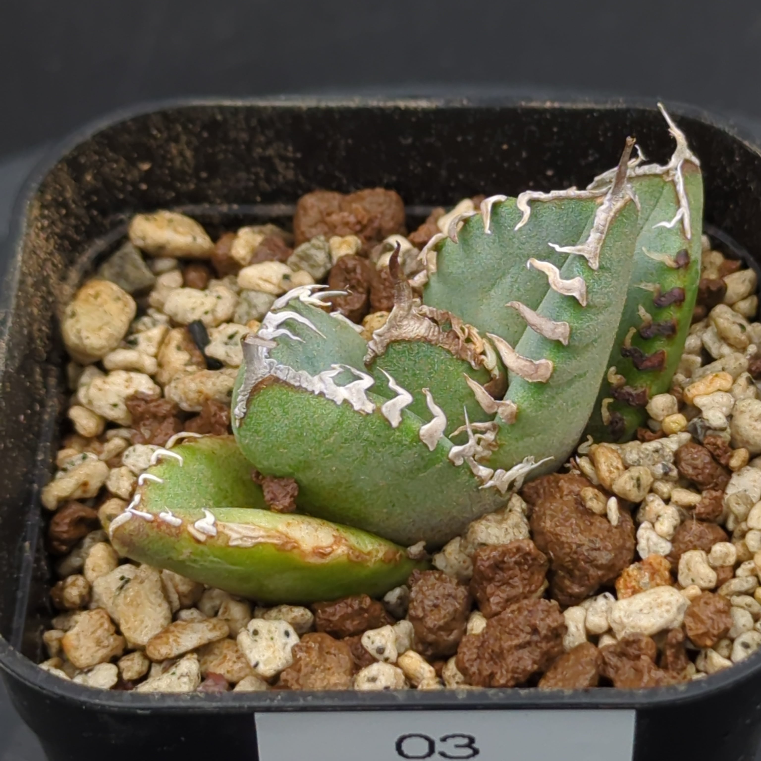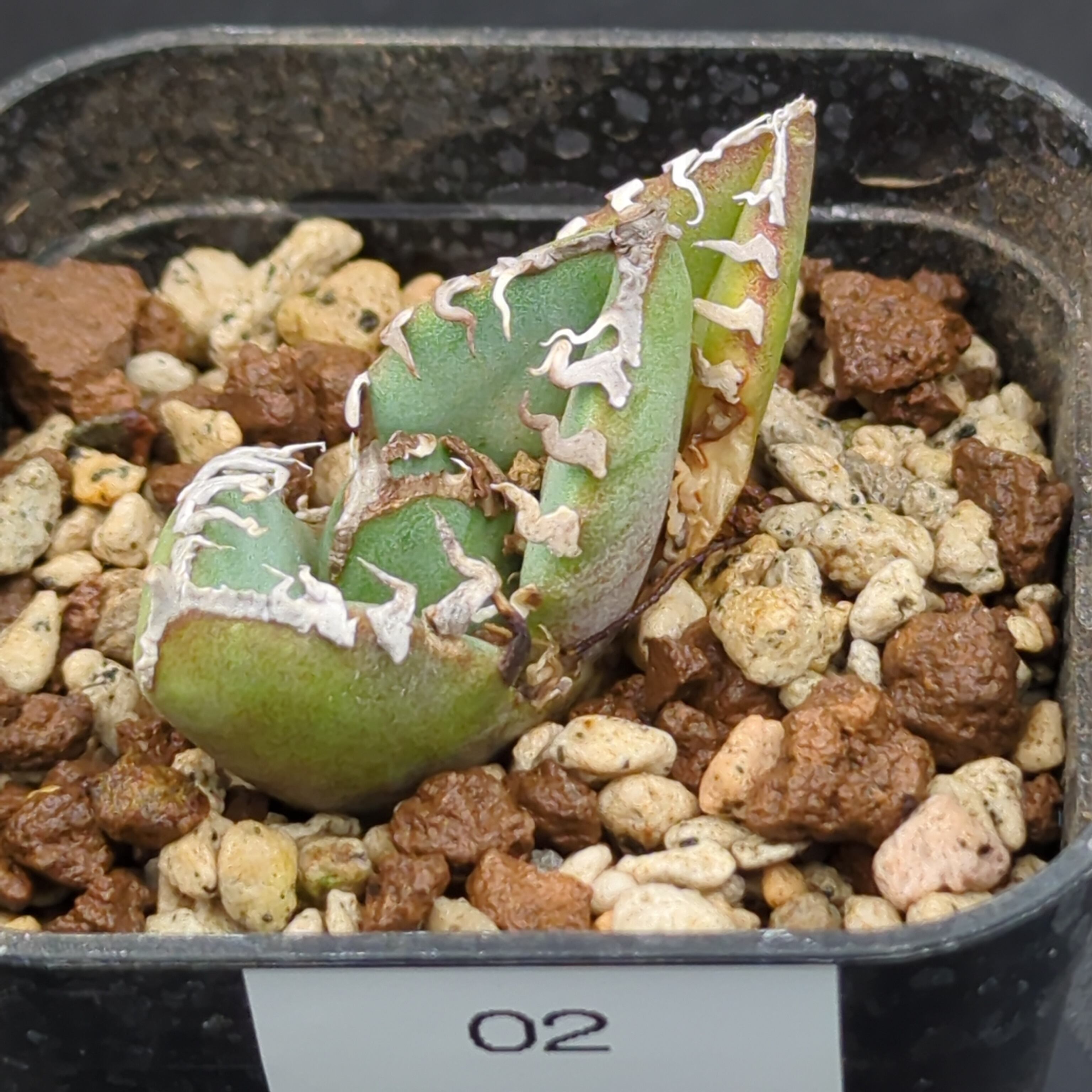 数あるアガベの中でも、特に希少性と人気を誇る「チタノタ 南アフリカダイヤモンド」、通称「SAD」の子株です。その名の通り、南アフリカ原産のチタノタをルーツに持ち、まるでダイヤモンドのような輝きを放つ白い鋸歯が最大の魅力。葉の縁を飾る純白のうねるような鋸歯は、成長と共に複雑な模様を描き出し、見る者を惹きつけます。肉厚で引き締まった葉と、そのコントラストが織りなすアートのような姿は、まさにアガベ愛好家垂涎の一品。これからじっくりと育て上げ、親株譲りの圧倒的な存在感をお楽しみいただけます。