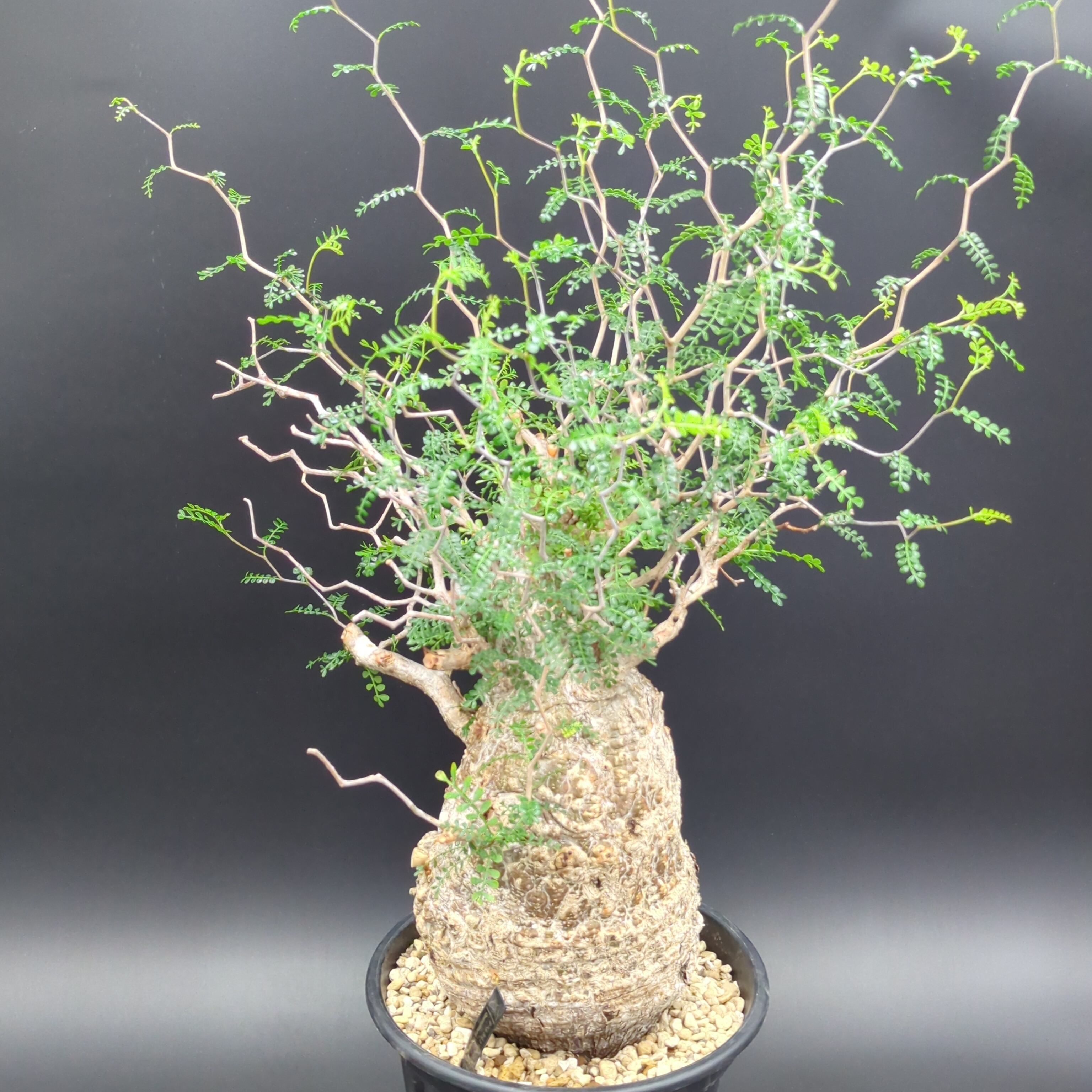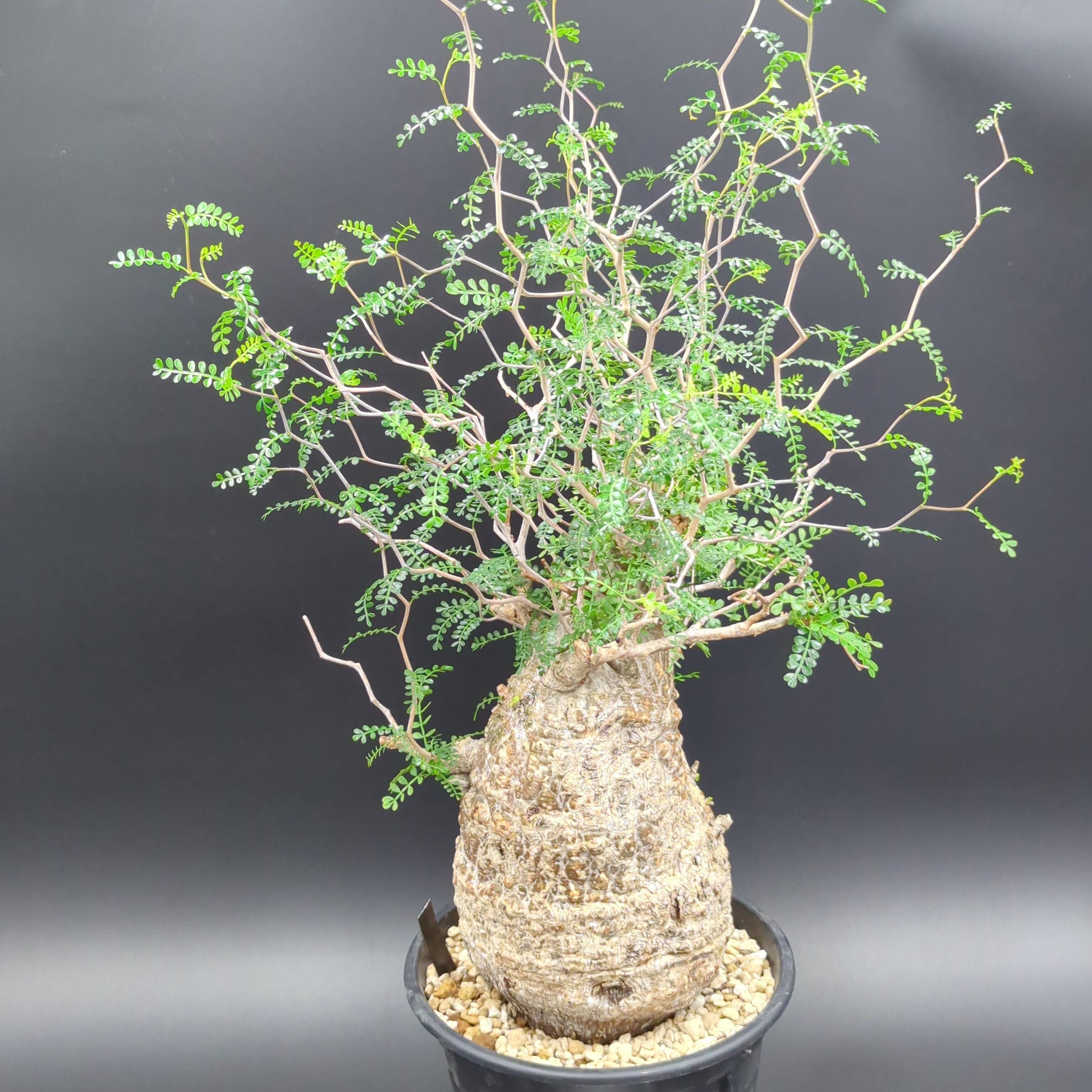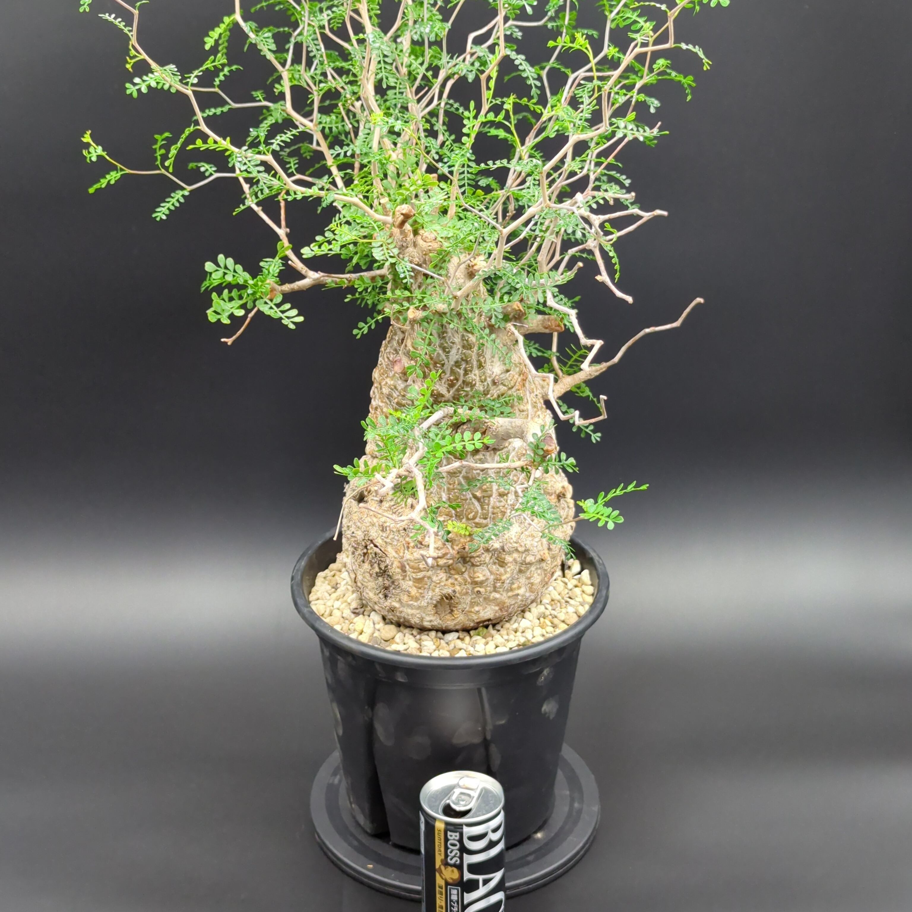 こちらの株は、長い年月をかけて自然の厳しい環境で育った、野性味あふれる「現地球」です。一つとして同じ形のない、ゴツゴツとした岩のような幹(塊根部)は、まさに地球が作り出したアート。その力強い幹から、繊細で涼しげな葉を茂らせる姿のコントラストが最大の魅力です。
