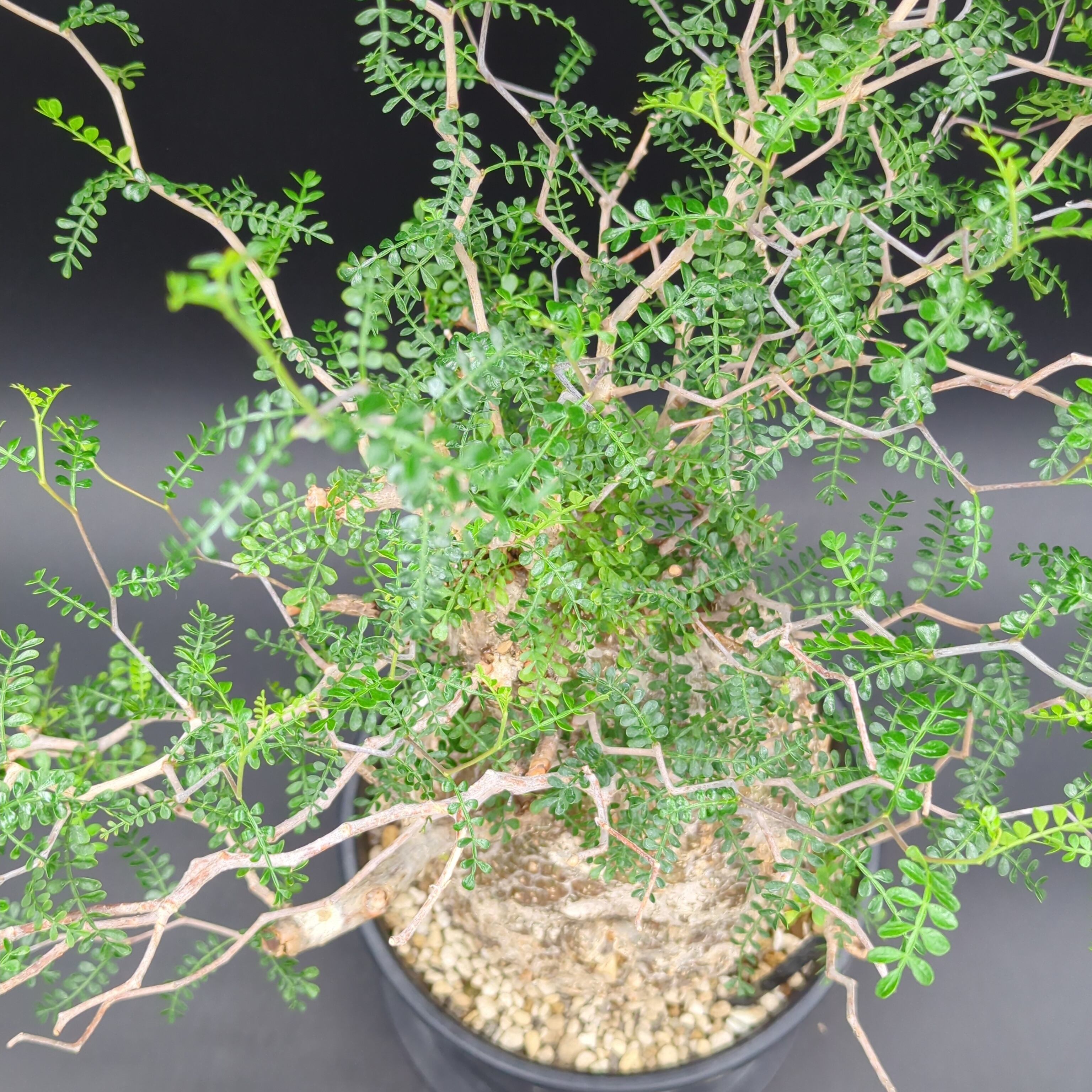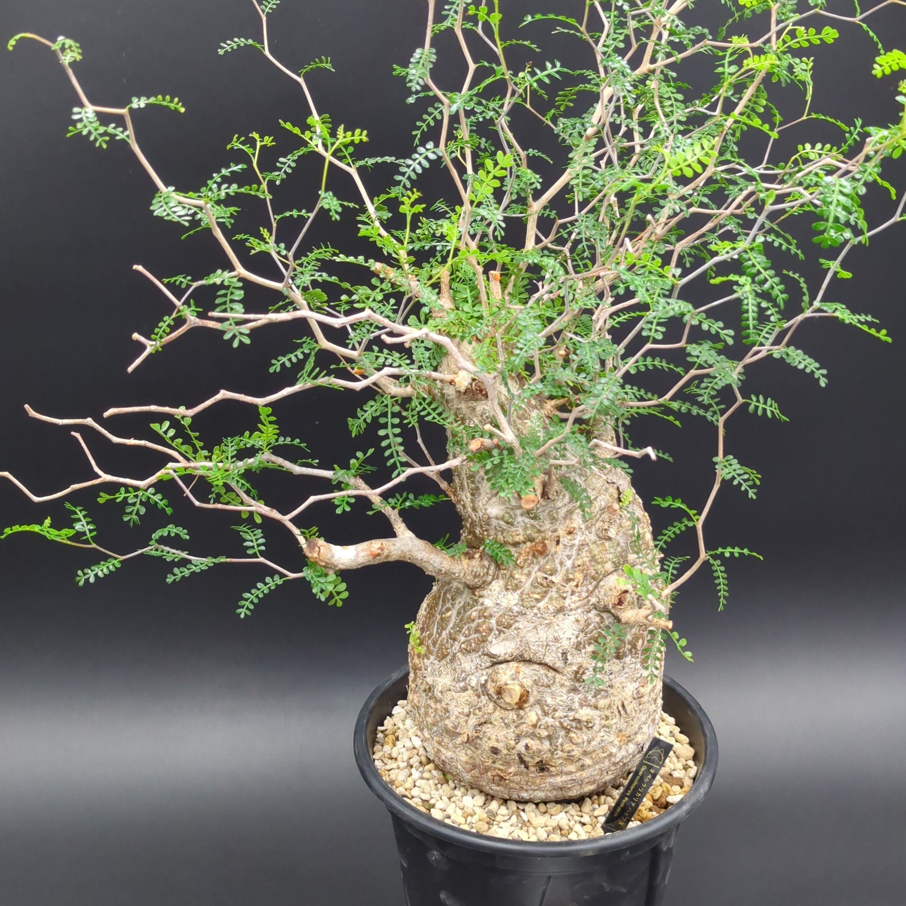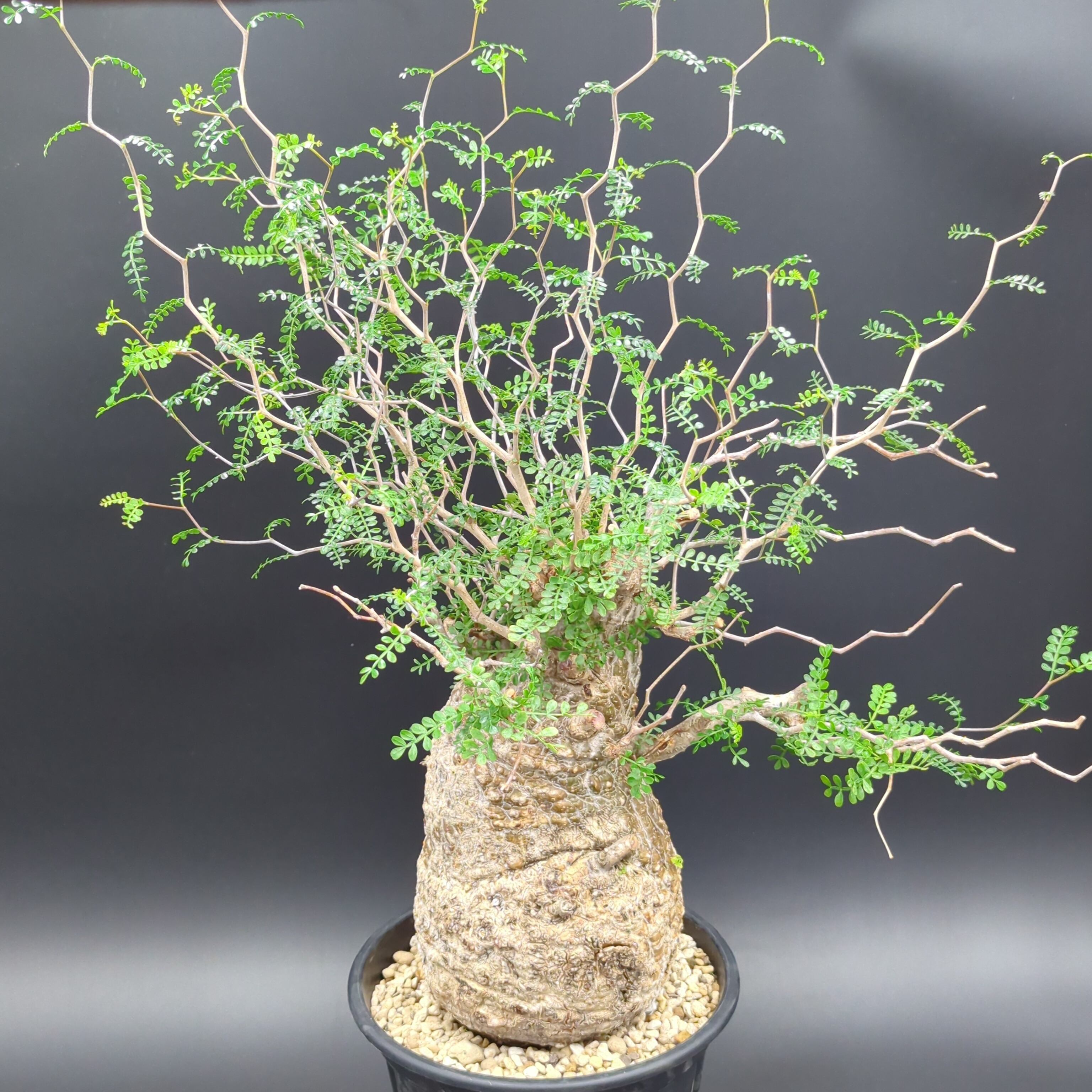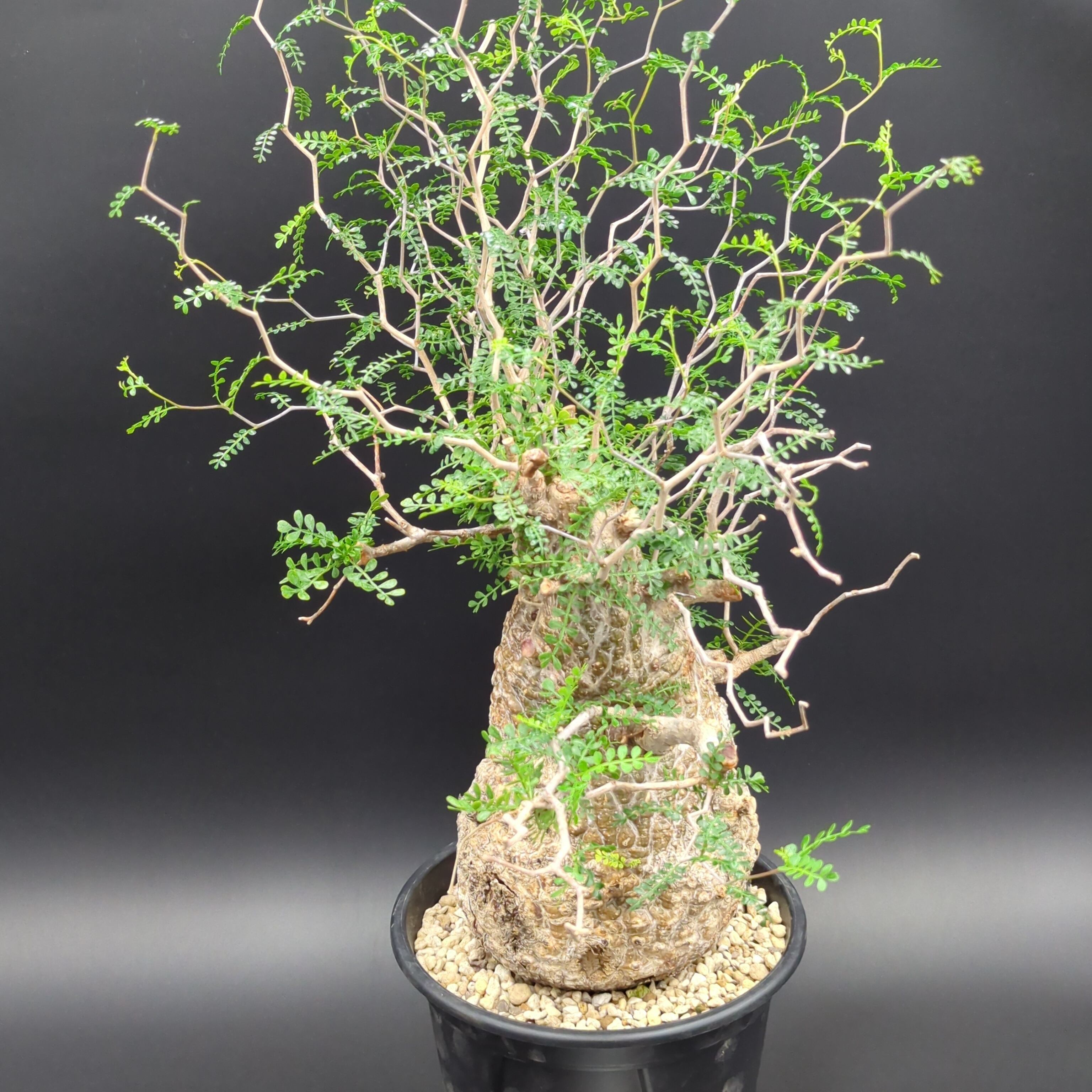 こちらの株は、長い年月をかけて自然の厳しい環境で育った、野性味あふれる「現地球」です。一つとして同じ形のない、ゴツゴツとした岩のような幹(塊根部)は、まさに地球が作り出したアート。その力強い幹から、繊細で涼しげな葉を茂らせる姿のコントラストが最大の魅力です。