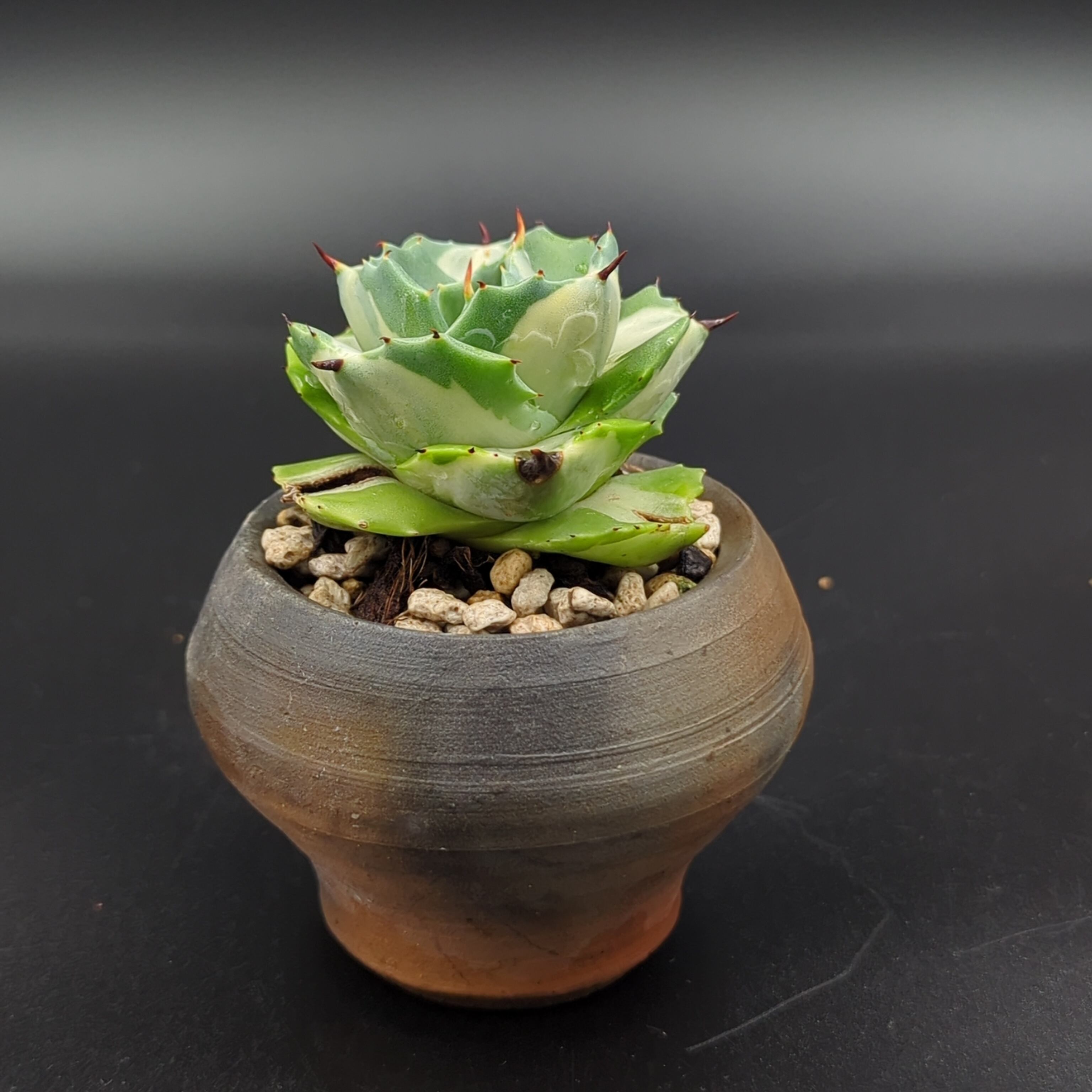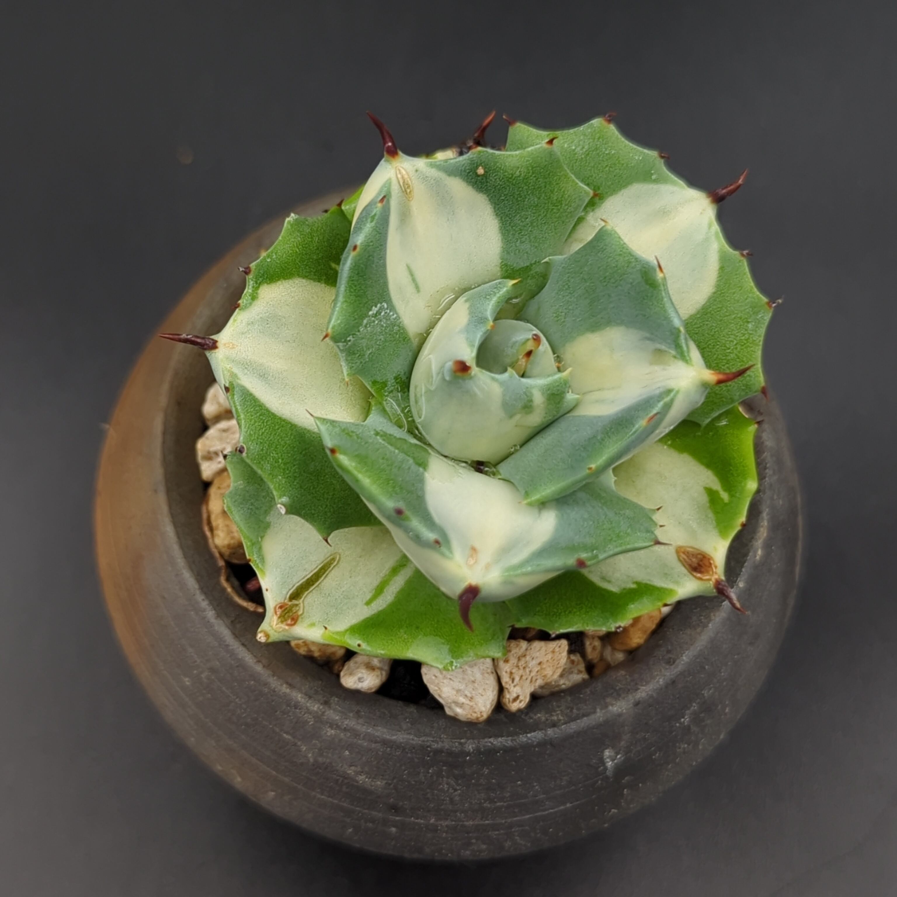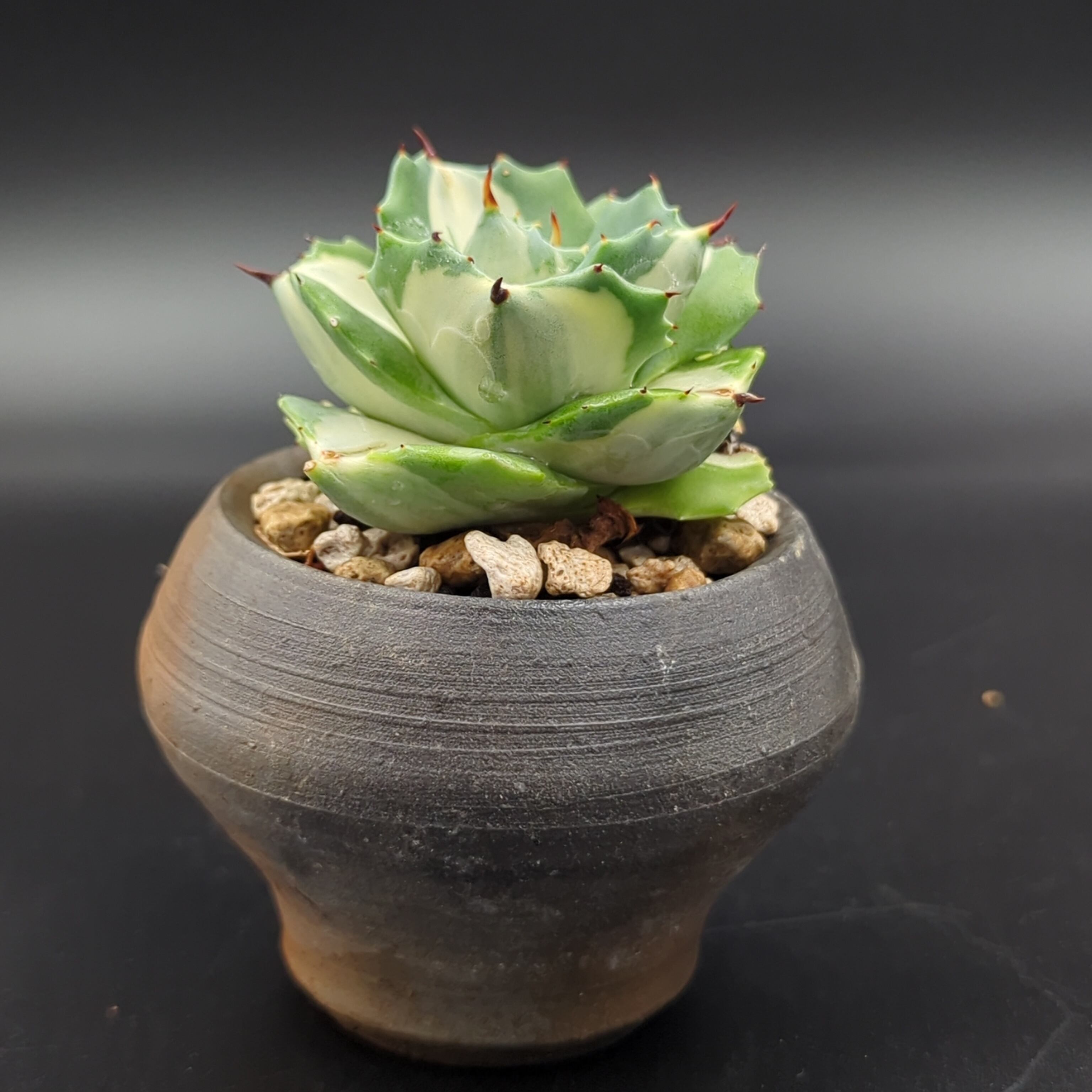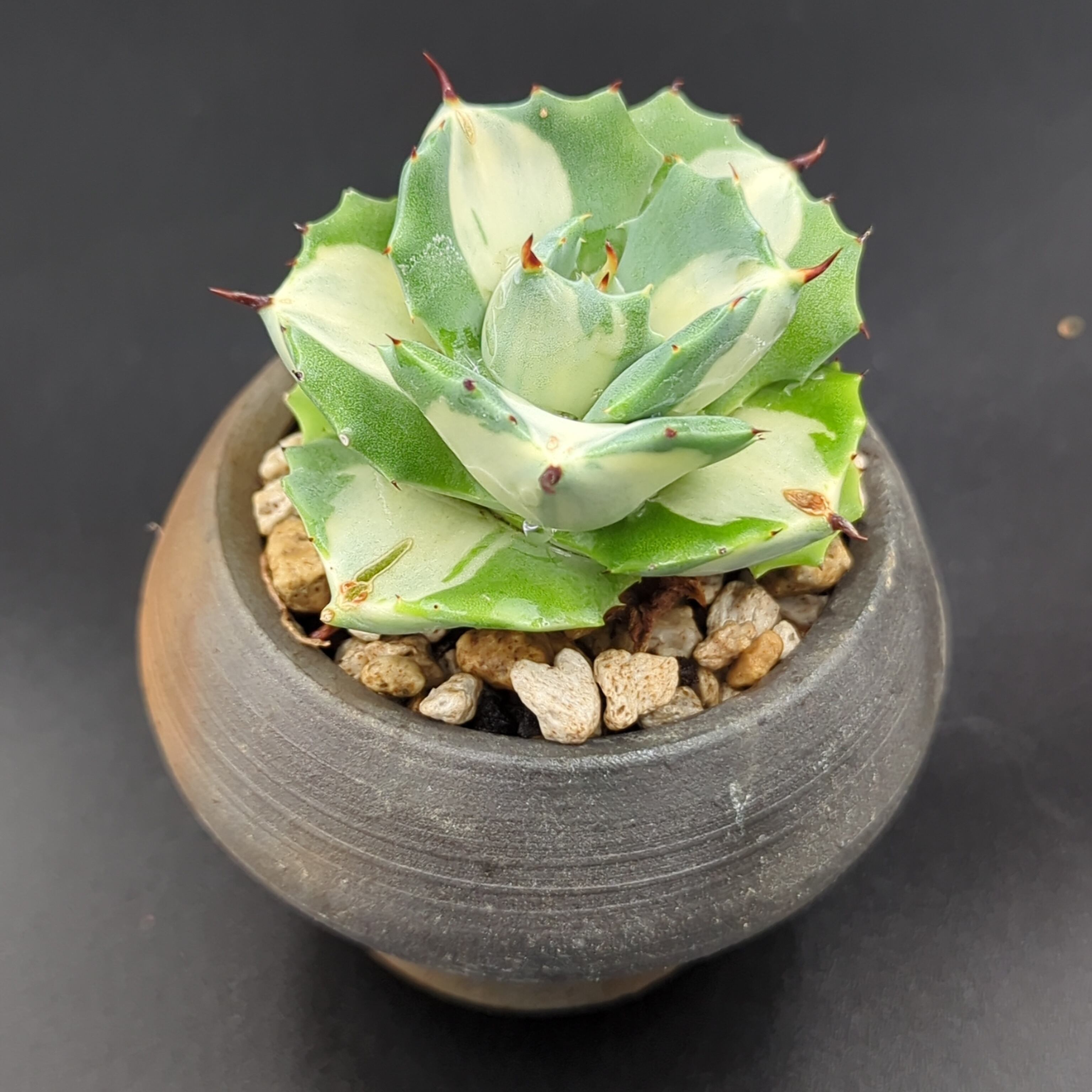 アガベの人気品種「吉祥冠錦」の中でも、特に葉が短く詰まって育つ "矮性" で、かつ純白に近い美しい "白覆輪斑" が現れた選抜個体、それが「王妃雷神錦(おうひらいじんにしき)」です。