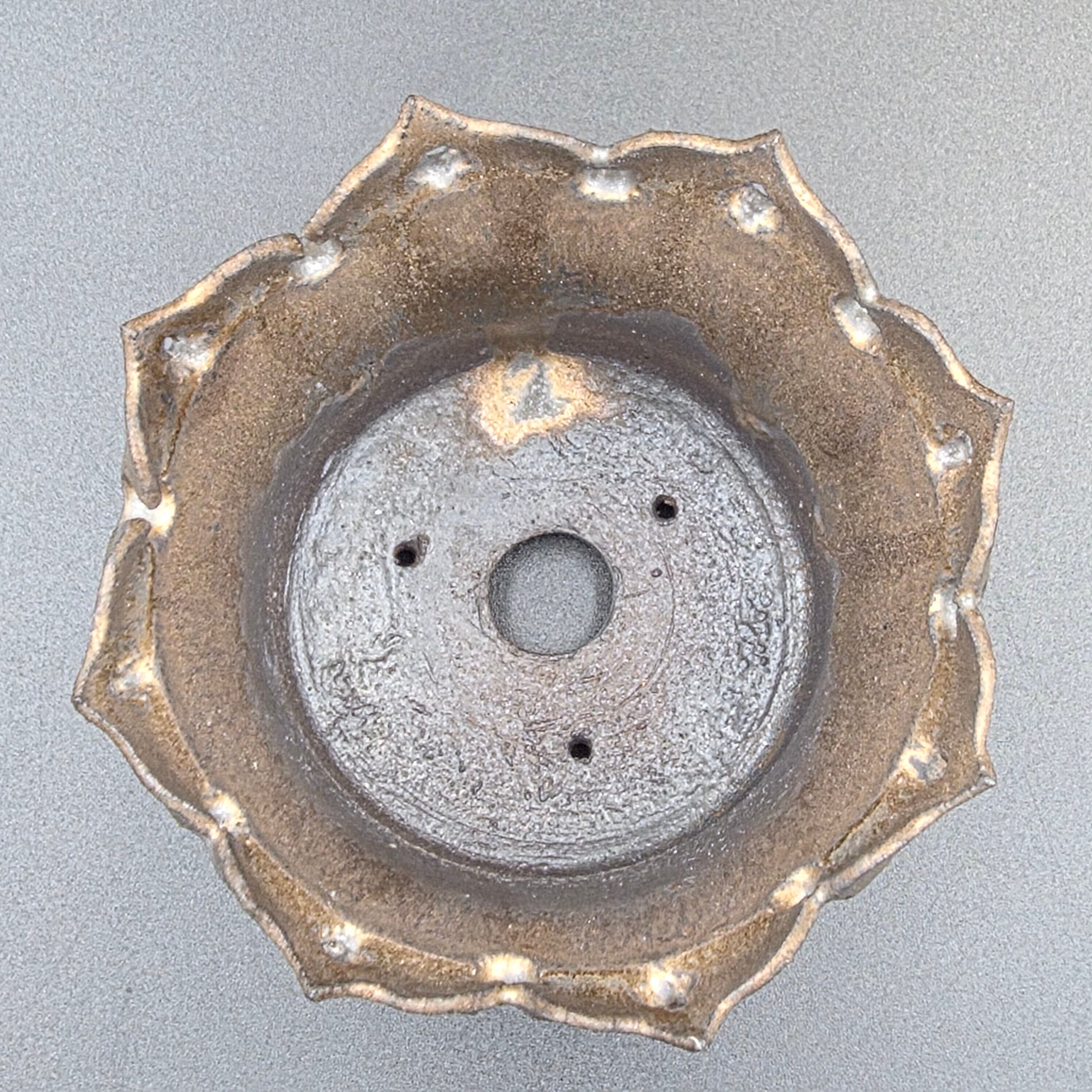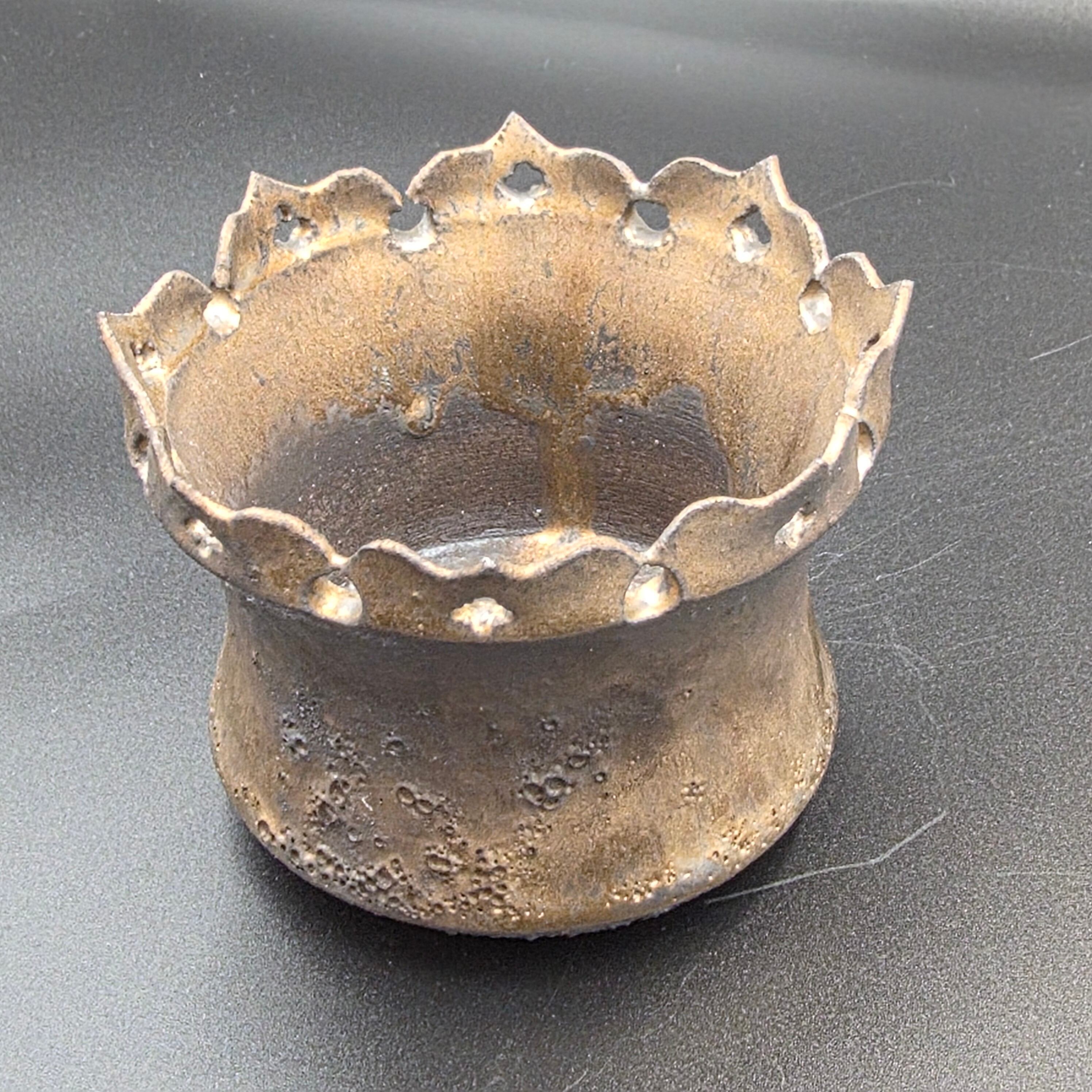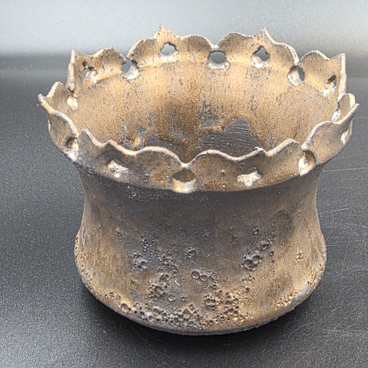 金属を思わせる重厚な質感と、ブロンズやゴールドが混じり合う複雑な色合いが特徴。表面の荒々しいクレーターのような肌質は、まるで火山の溶岩石や月面を彷彿とさせ、見る角度によって様々な表情をみせてくれます。