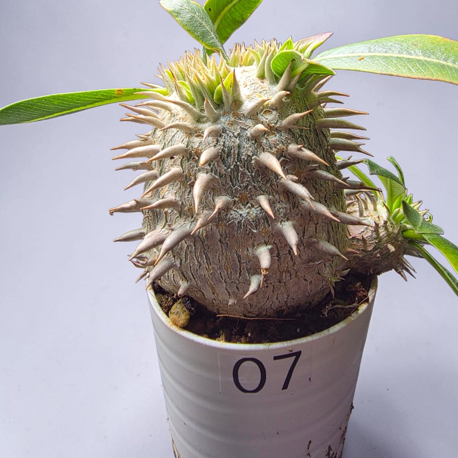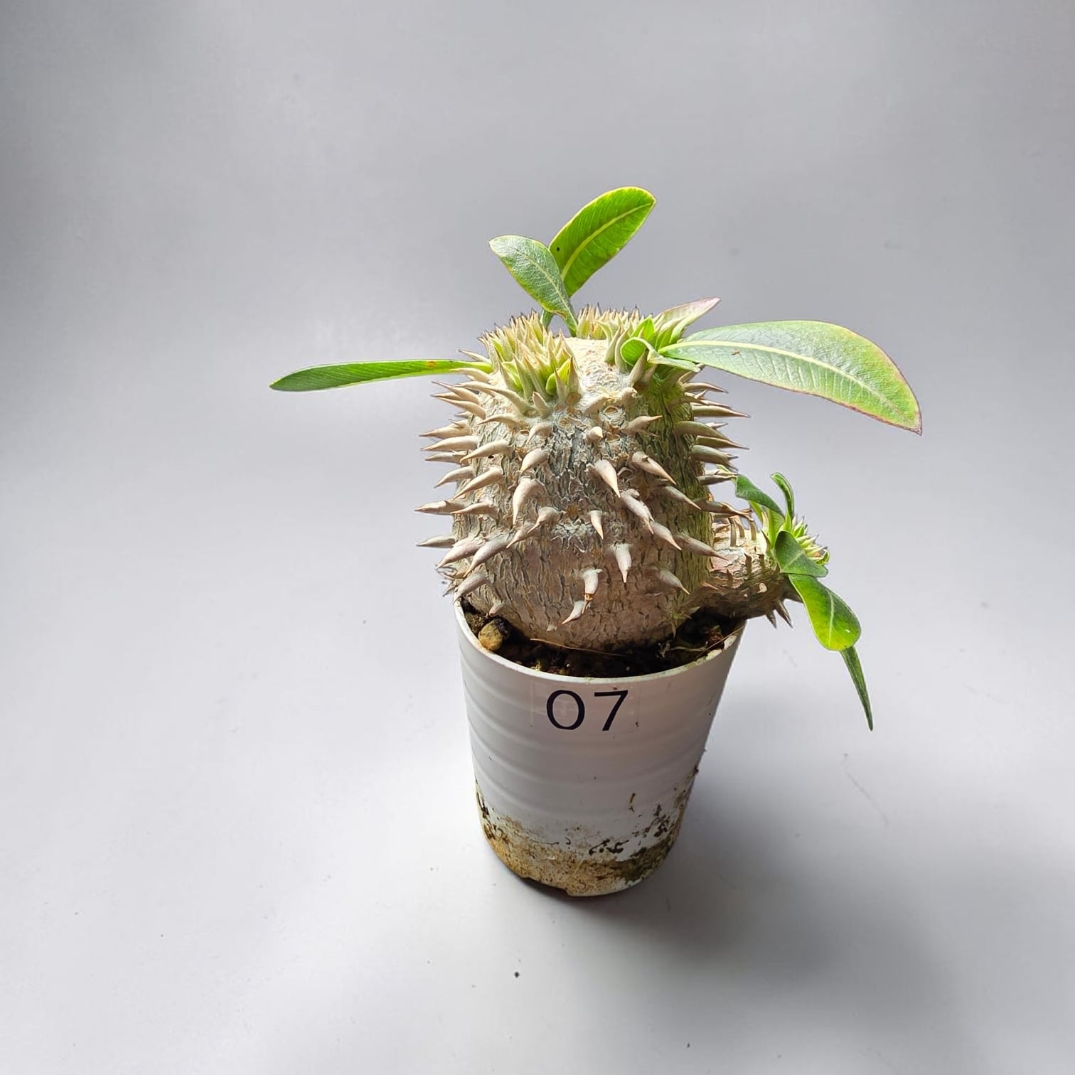 その名の通り「象牙のような」白く美しい肌を持つ、希少なパキポディウム・エブレネウム。なかでも、こちらの株はご覧の通り、ずんぐりとまん丸に締まった、非常に美しいフォルムが魅力的な特選株です。