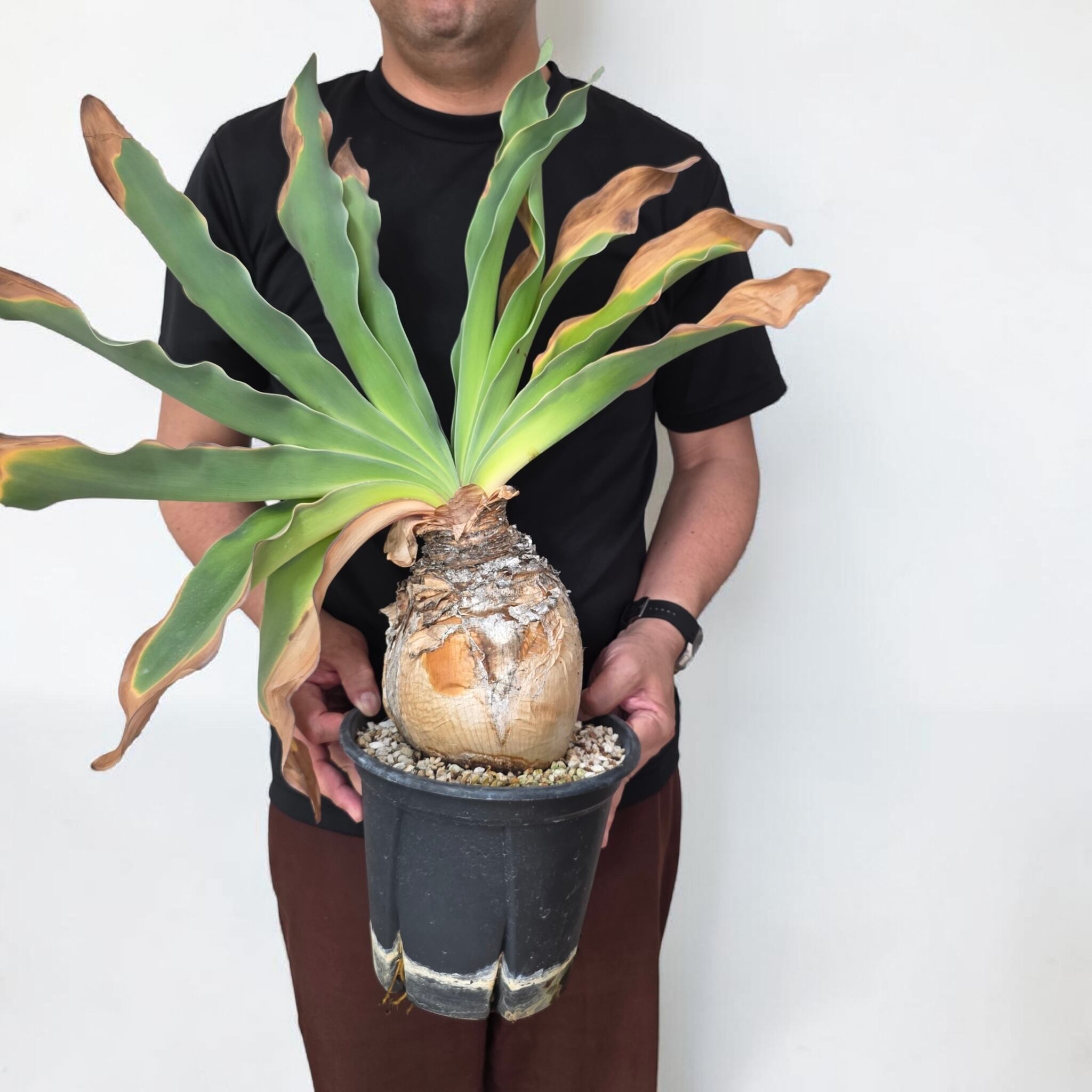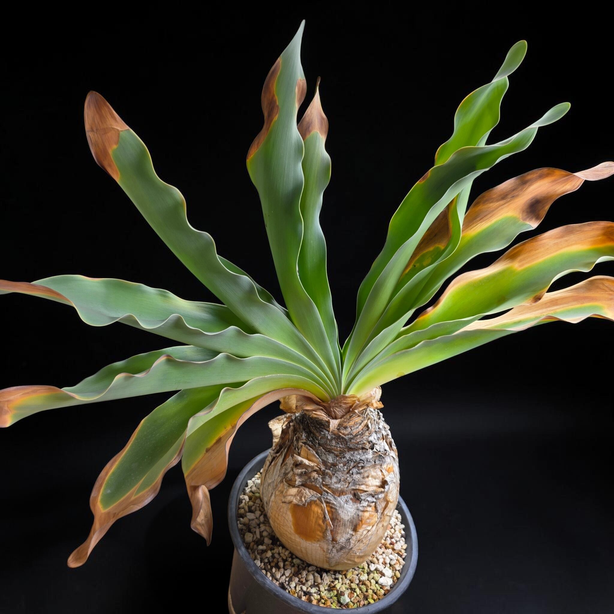 写真(人物との比較)からもお分かりいただける通り、長い年月を経て形成された巨大な球根は圧巻の一言。幾重にも重なった枯れ皮(チュニック)が、現地球のような野性味と歴史を感じさせます。そこから扇状に展開する、うねりを帯びた肉厚で青みがかった葉は非常に美しく、まるで生きる芸術品のようです。