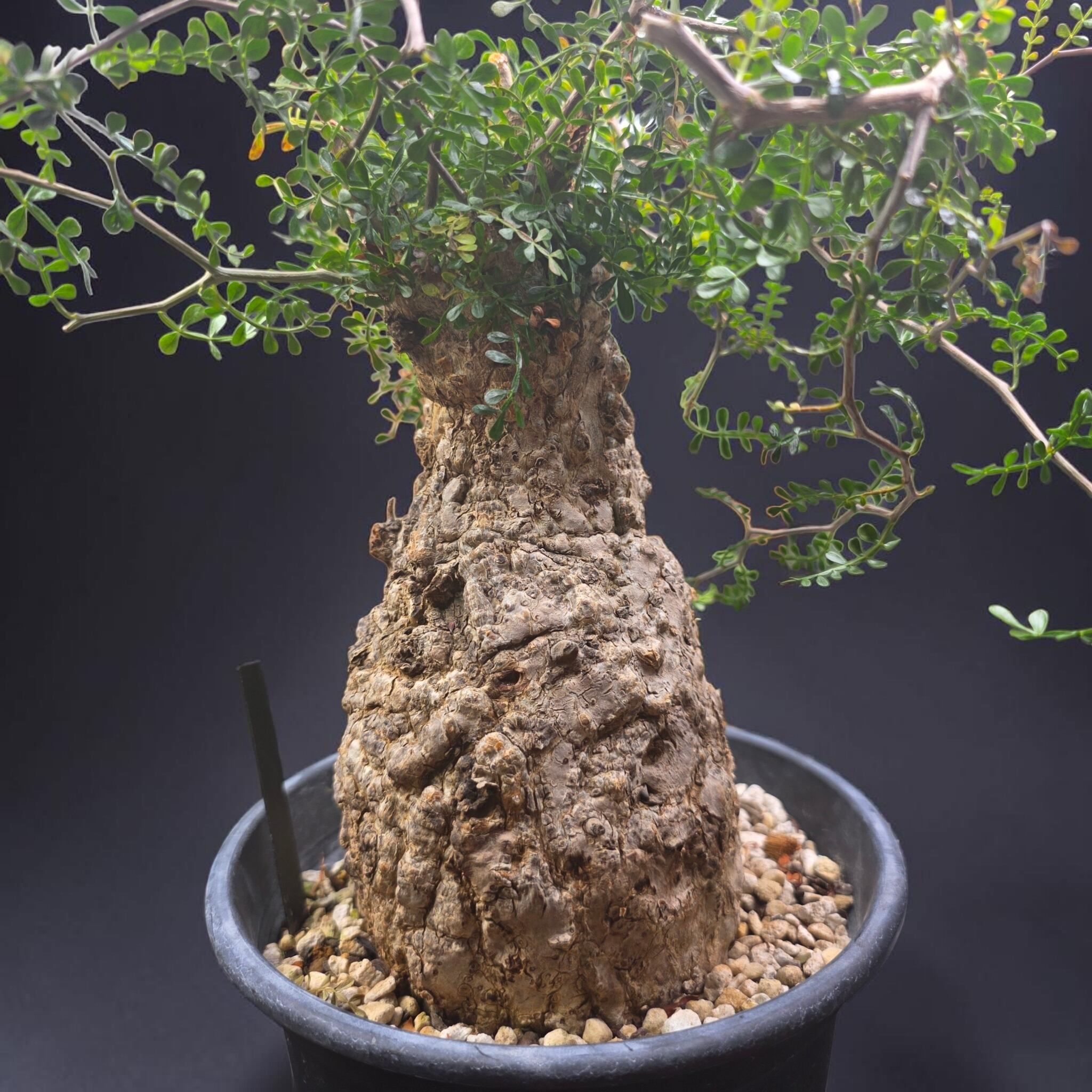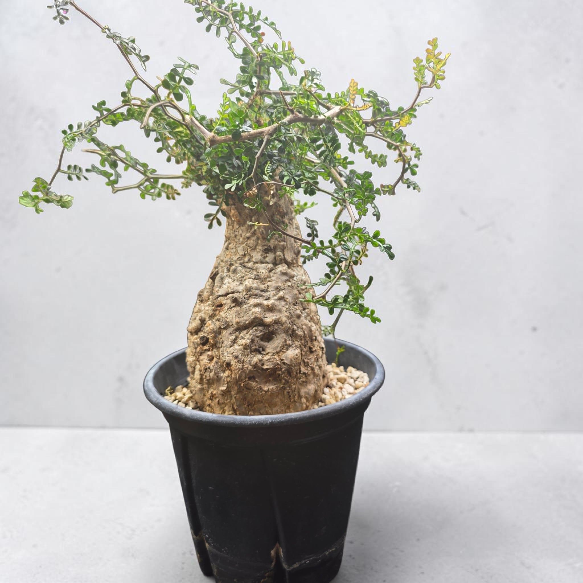 こちらの株は、長い年月をかけて自然の厳しい環境で育った、野性味あふれる「現地球」です。一つとして同じ形のない、ゴツゴツとした岩のような幹(塊根部)は、まさに地球が作り出したアート。その力強い幹から、繊細で涼しげな葉を茂らせる姿のコントラストが最大の魅力です。